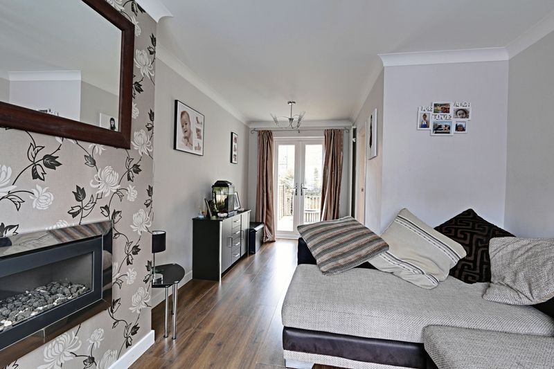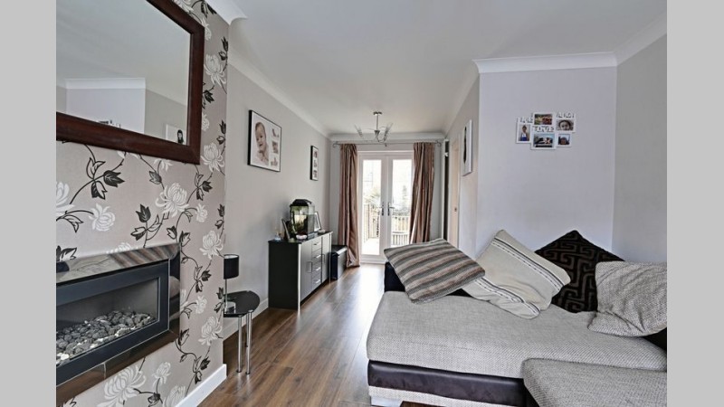 Inset contemporary gas fire and double glazed French doors leading into rear garden.