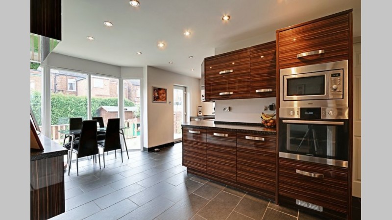 Modern fitted kitchen with wall and base level units, work surfaces over, inset one and a quarter bowl sink drainer unit, integrated oven, hob, extractor hood over, microwave, space for American style fridge freezer and integrated dishwasher.