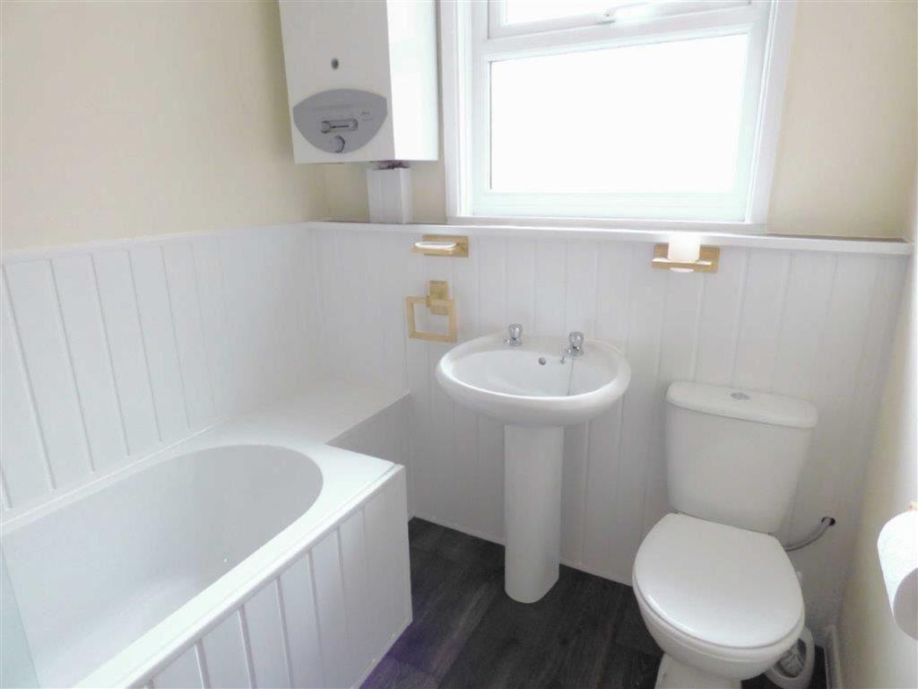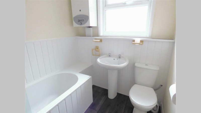 Bathroom - Three piece suited bathroom including sink, toilet, bath with electric shower over with shower curtain. Hard wood flooring for easy maintenance and white tiled splash backs to bath area.